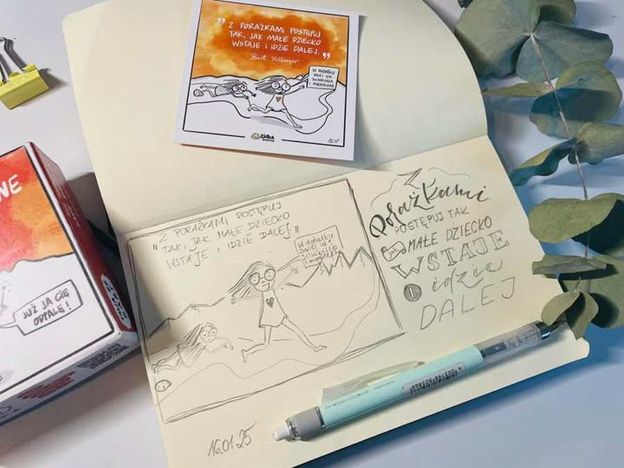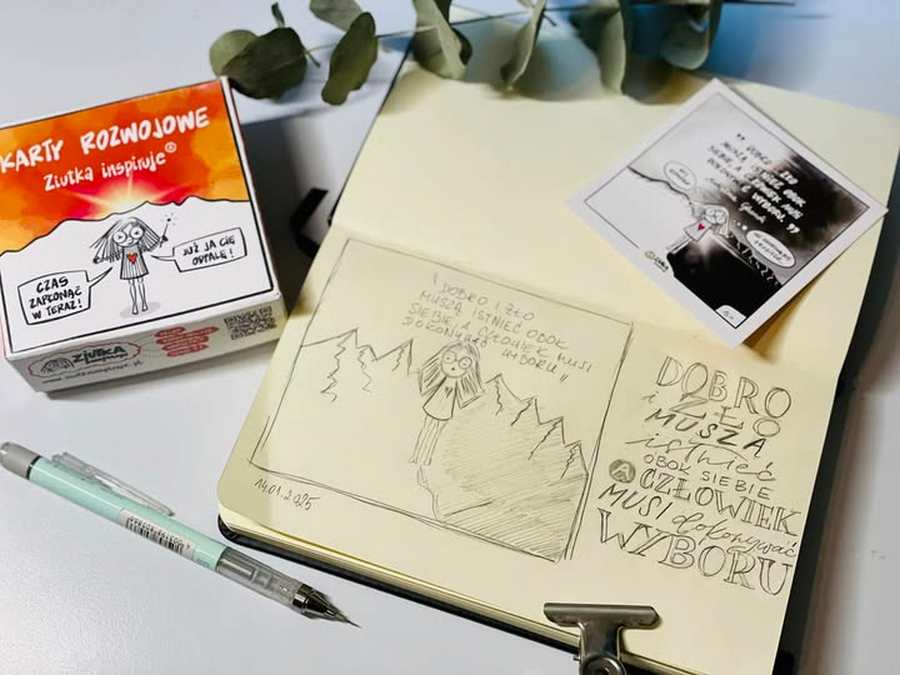 Postanowiłam wrócić do korzeni i przeprosić się z ołówkiem. Zaczęłam systematycznie odwzorowywać karty rozwojowe Ziutki oraz szkicuję sobie cytaty z kart. O kartach rozwojowych Ziutki pisałam we wcześniejszym artykule.